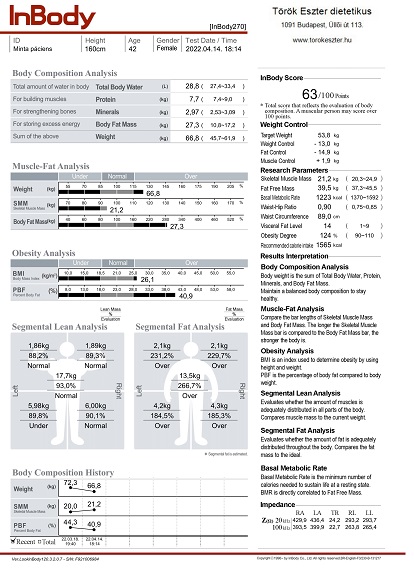 - InBody pontszám (Ez a pontszám a testösszetétel kiértékelését mutatja, amely magába foglalja a testben lévő izmot, zsírt és vizet.)